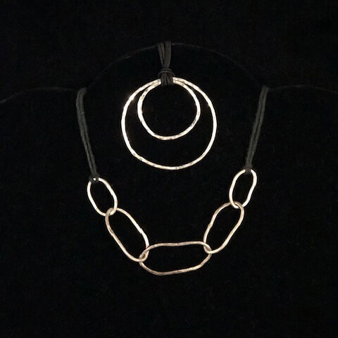 Sterling silver double hoop pendant Sterling silver five-loop chain by Marcy Johnson