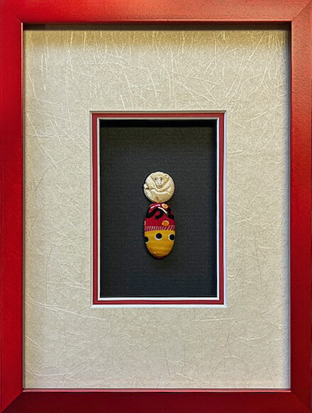 "Monkey” by Madrone Moulton Bone and glass bead with metal frame - 6" x 8"