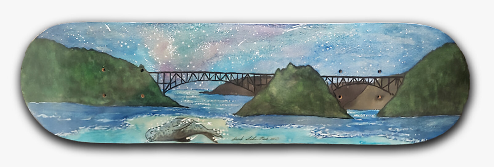 "West Starboard" by Sarah Silverman-Pucci Watercolor and acrylic on a wood skateboard