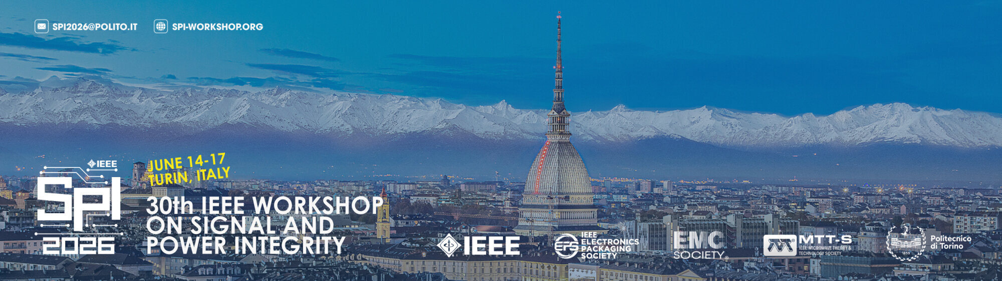 Visit our website for further information about SPI 2026 and follow our social media channels to stay updated on the latest news. Feel free to disseminate the workshop within your institution or company, as well as to your fellow colleagues and students. It is a pleasure to invite you all to send a contribution and attend the 30th IEEE Workshop on Signal and Power Integrity, taking place as in-person event from June 14 to 17, 2026, in Turin, Italy!