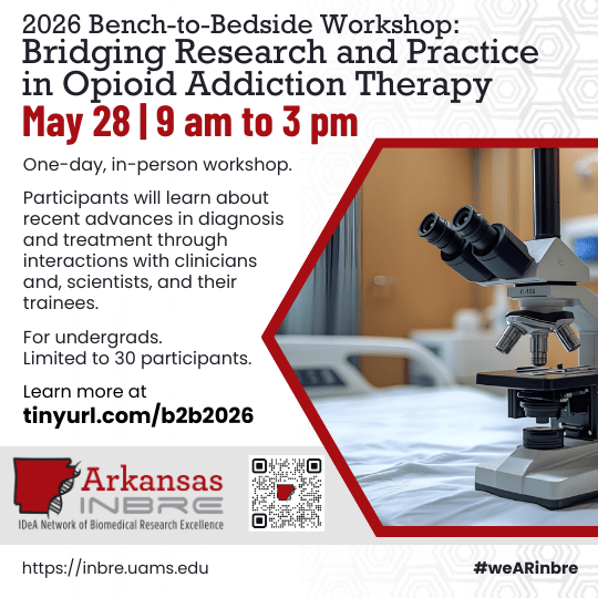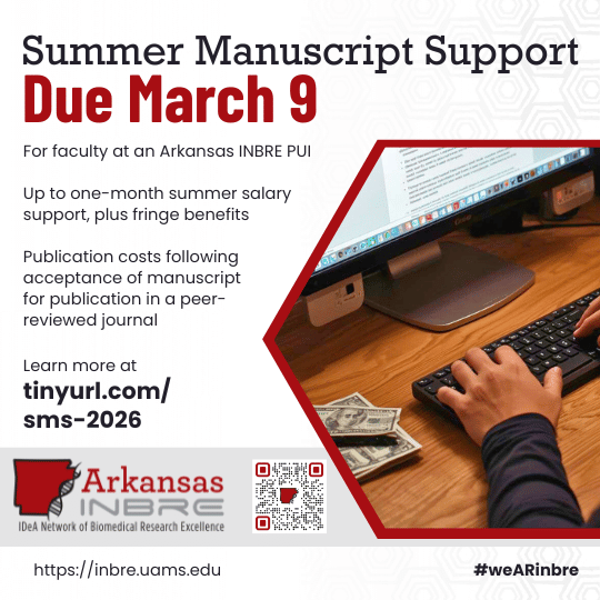Copyright © 2024 Arkansas INBRE, All rights reserved.Questions or more info, contact Cyndy Buckhaults, Media Specialist, cbuckhaults@uams.edu Material in this newsletter is supported by a grant from the National Institutes of Health National Institute of General Medical Sciences (5P20GM103429). Any opinions, findings, conclusions or recommendations expressed in this material are those of the AR INBRE Program and do not necessarily reflect the views of the NIH.