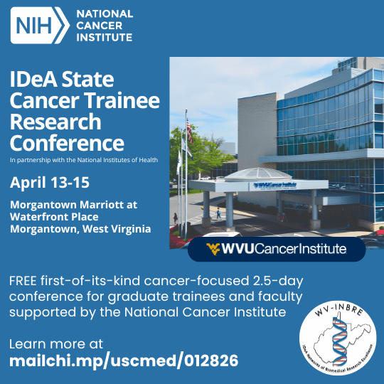Hosted by the WVU Cancer Institute, the symposium will be held April 13-15, at the Morgantown Marriott at Waterfront Place in Morgantown, WV. The 2.5-day conference will bring together graduate trainees and faculty from IDeA states.