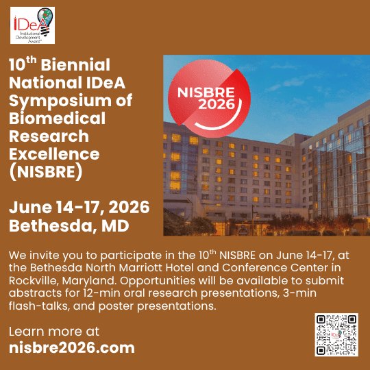 10th National IDeA Symposium of Biomedical Research Excellence (NISBRE2026), to be held June 14-17 at the Bethesda North Marriott Hotel and Conference Center, Rockville, MD, is a biennial national meeting showcasing the scientific and training accomplishments of the NIGMS IDeA program.