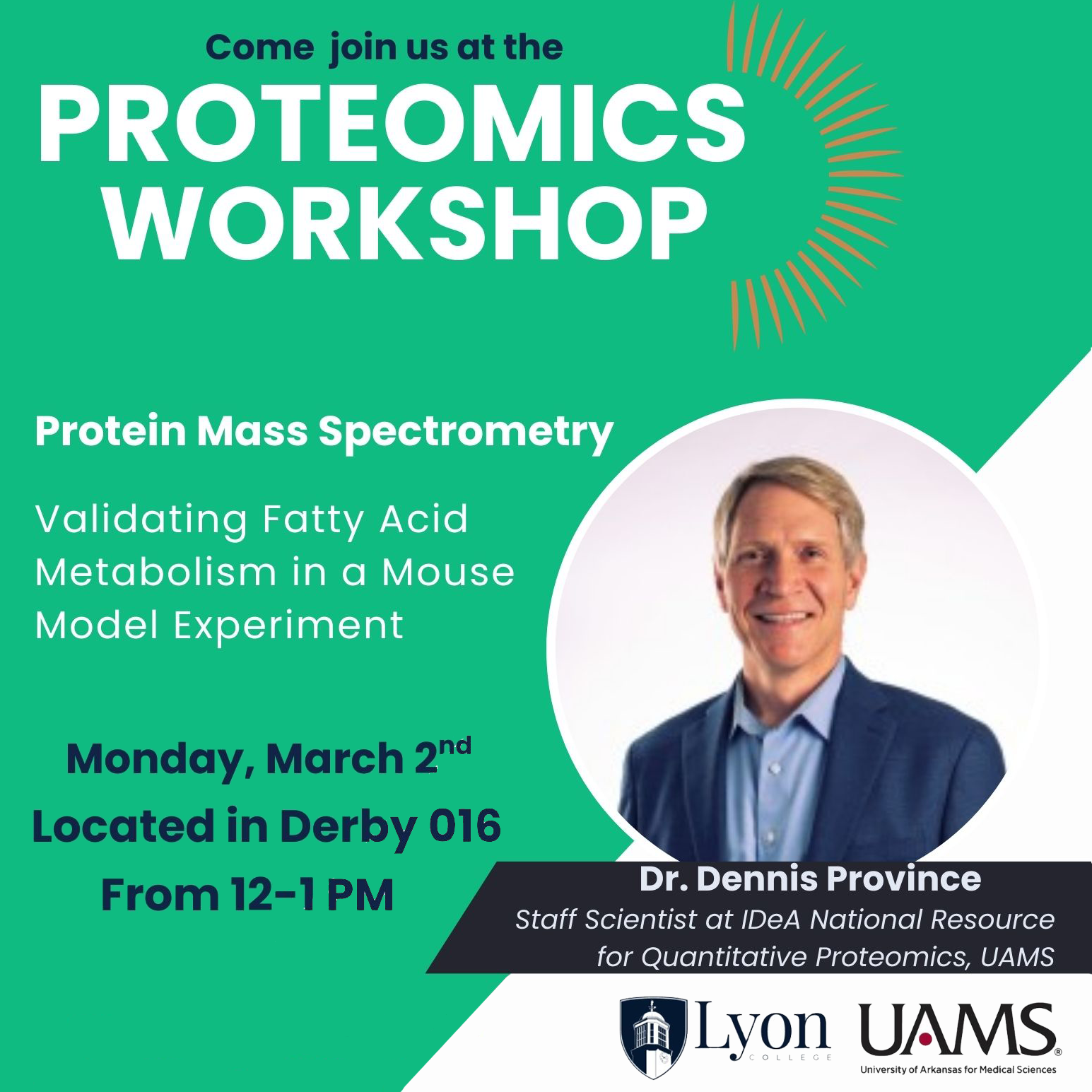 Proteomics Workshop Come join Lyon College and UAMS for a Proteomics Workshop on Mon, March 2, 12 noon to 1 pm, at Lyon College, Derby 16, Derby Center for Science and Mathematics (driving directions).