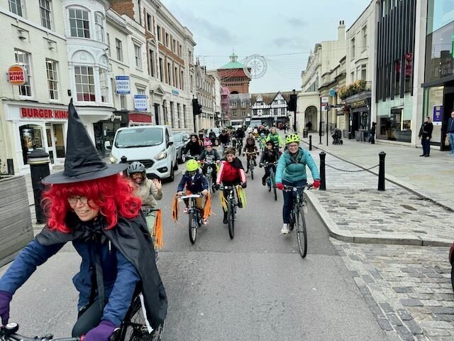 Michael Lilley, the mayor of Colchester, waved the flag to start the Kidical Mass ride on October 26. This time the event had a spooky theme for Halloween.